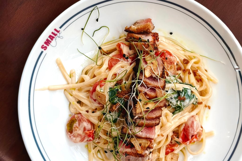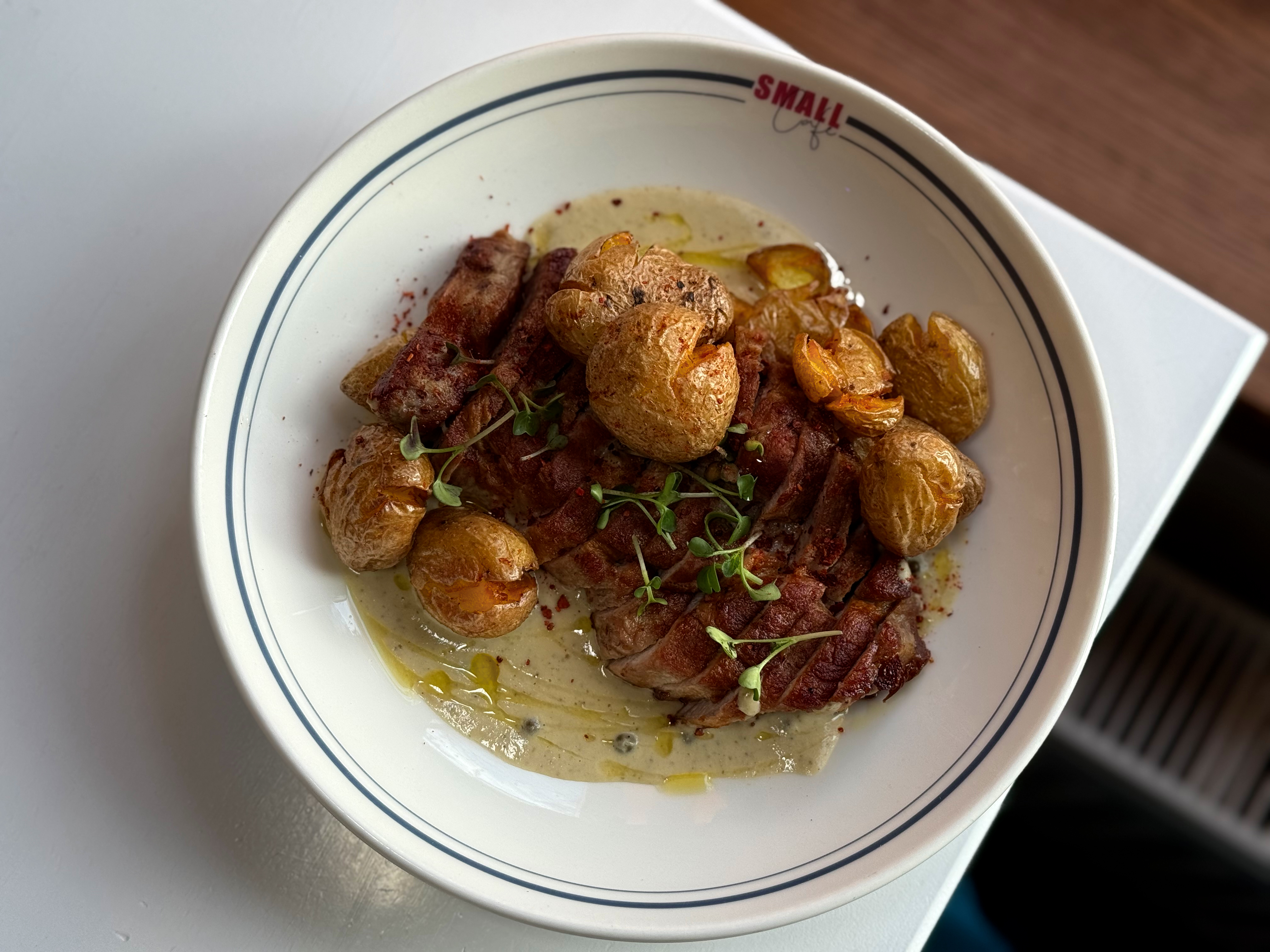 Смажена свинина з бебі картоплею та соусом Пеперкорн